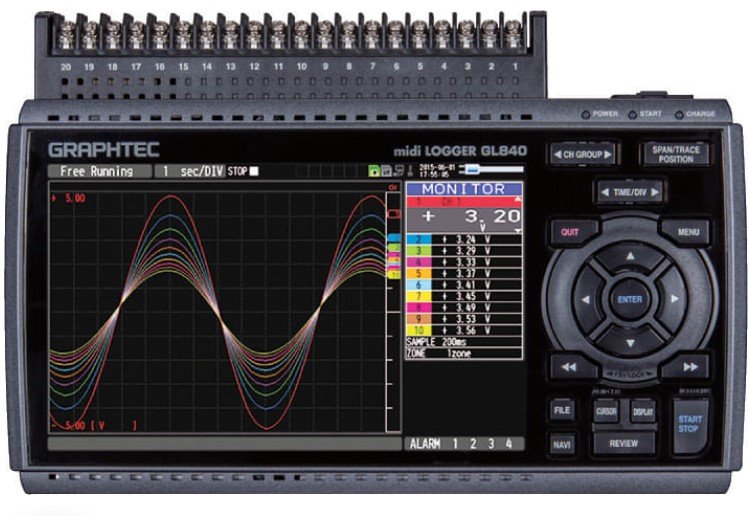The Graphtec GL840M is a high-quality 20-channel datalogger that is expandable up to 200 total channels. Each channel is isolated. This unit is suitable for many applications including temperature measurement with multiple channels. The built-in 7-inch color display provides an intuitive data viewing experience. Although this system is designed as a standalone unit, it can be connected to a PC if needed.